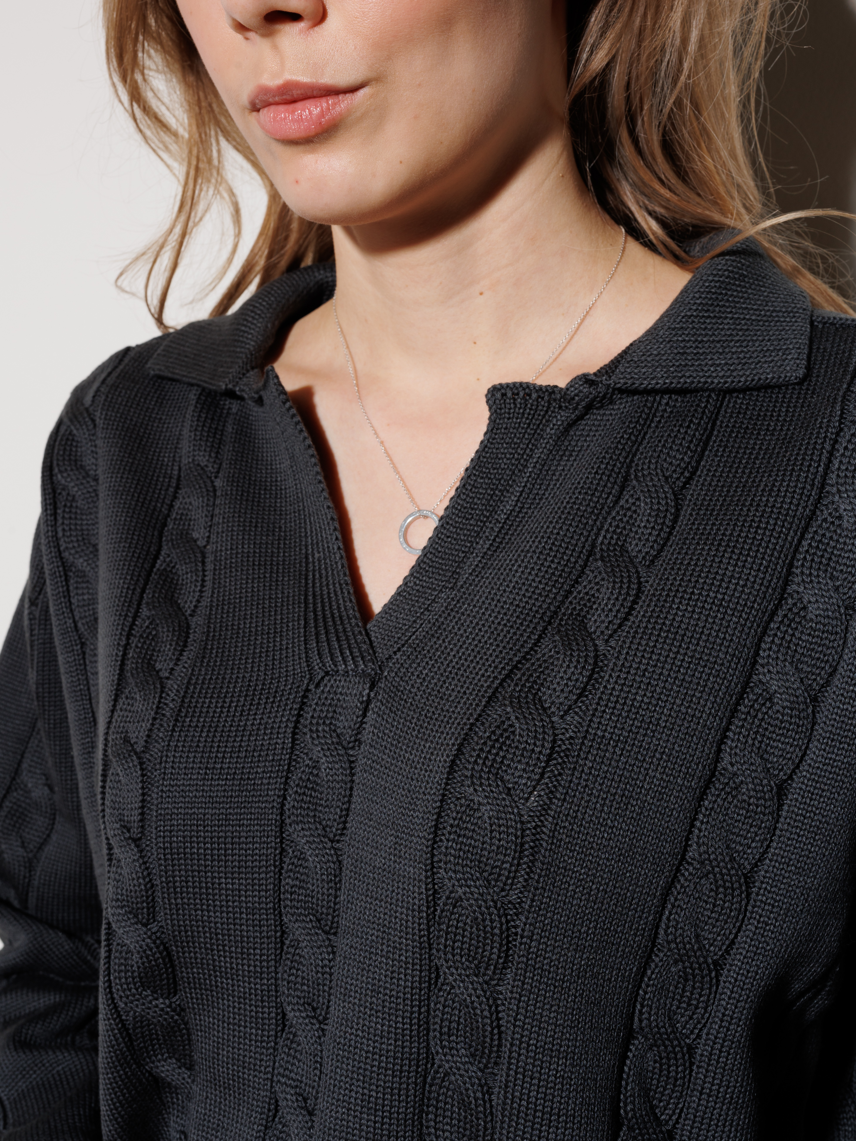Классический воротник-поло придаёт модели элегантность, а V-образный вырез добавляет нотку непринуждённости.