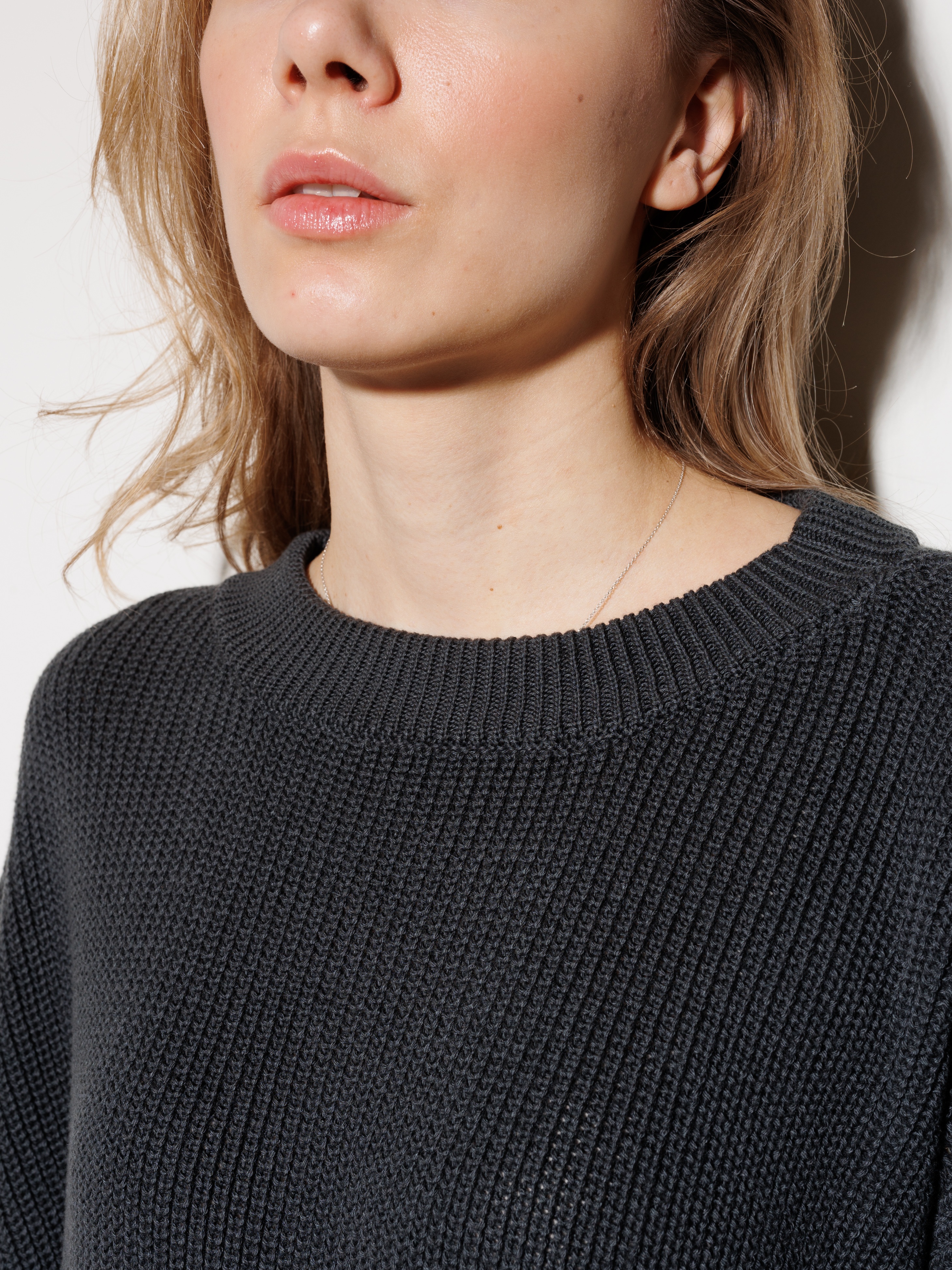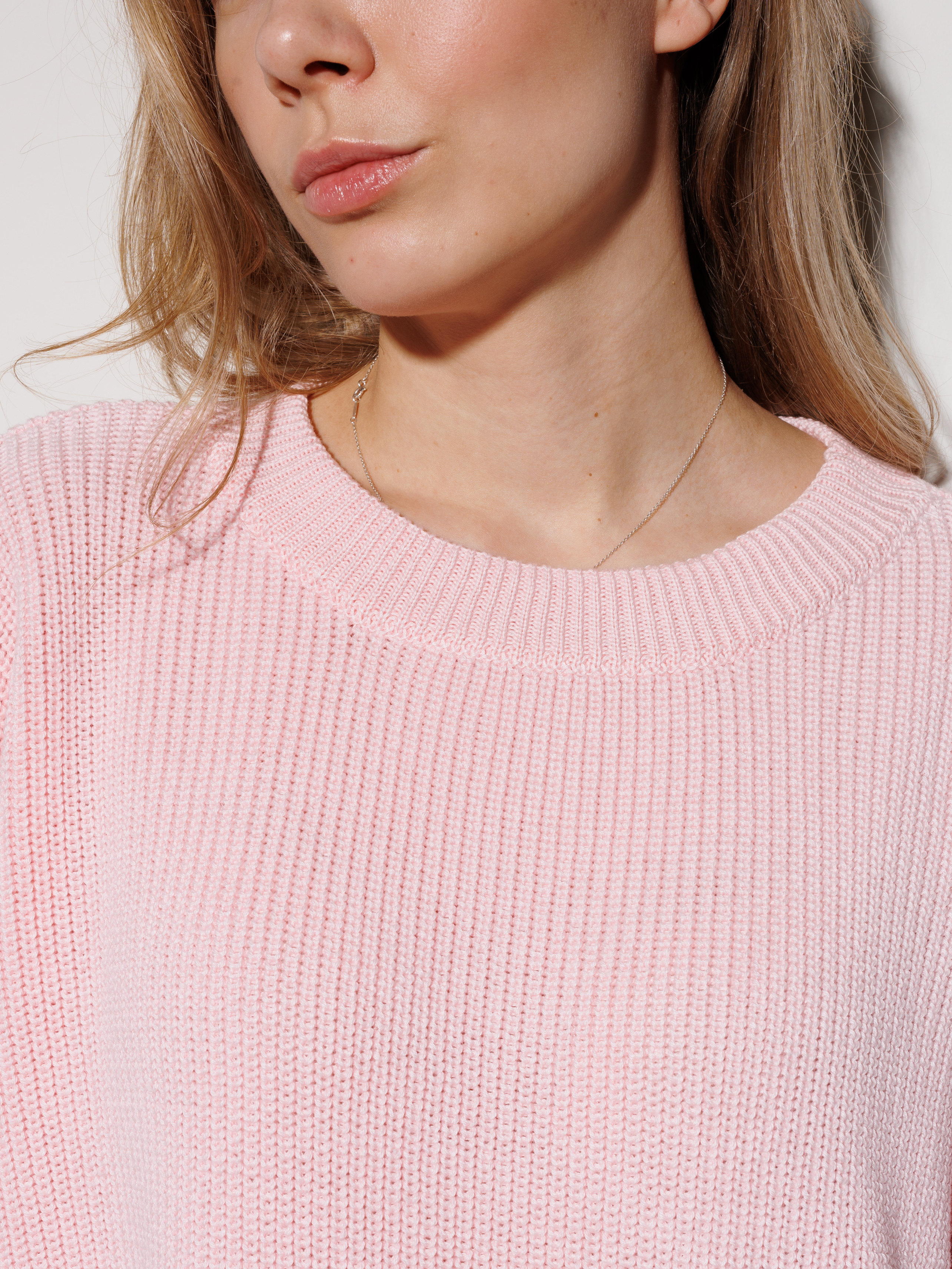 Классический круглый вырез — идеальная основа для многослойности. Он сочетается с чем угодно, от колье до массивных цепей.