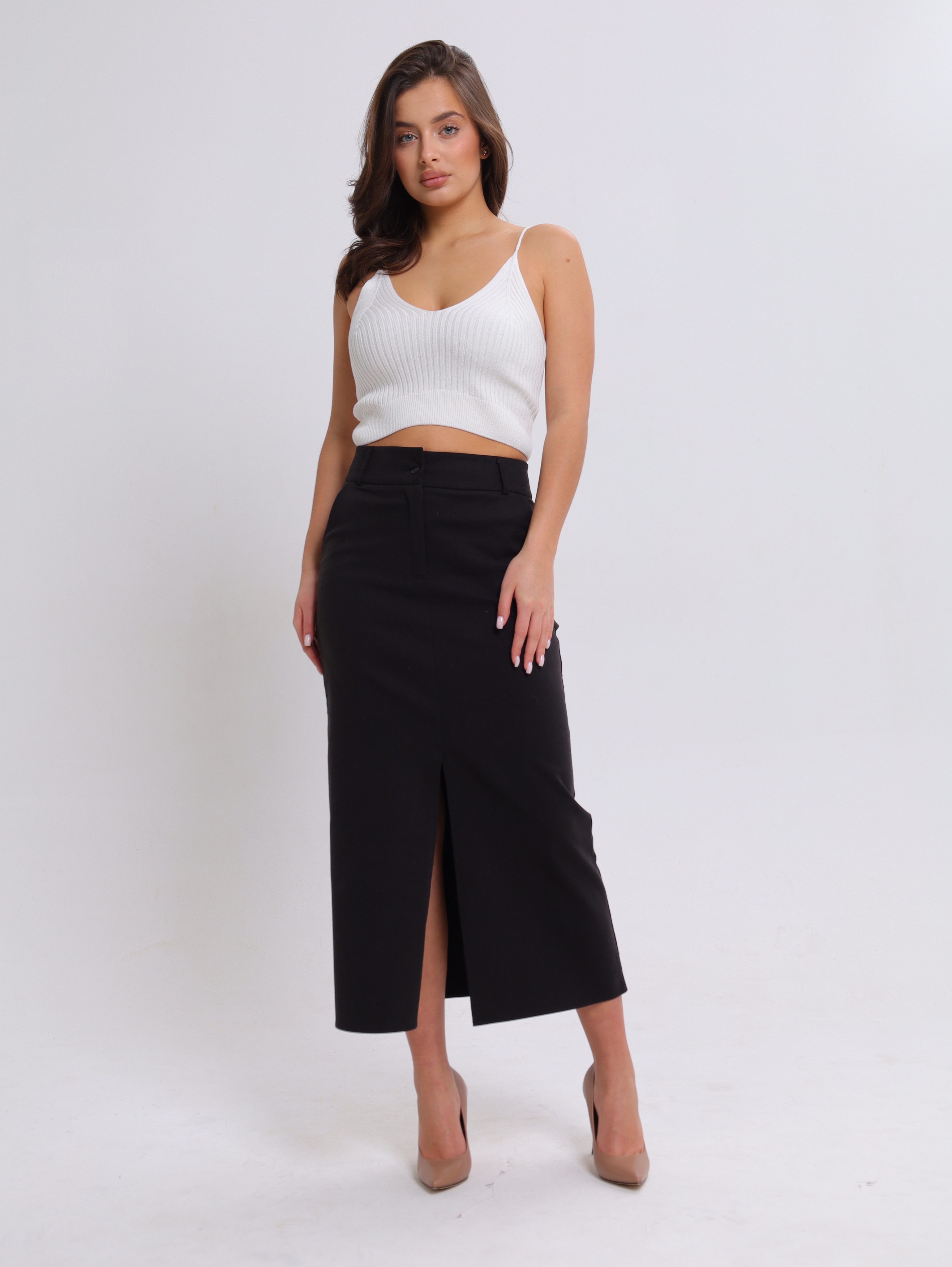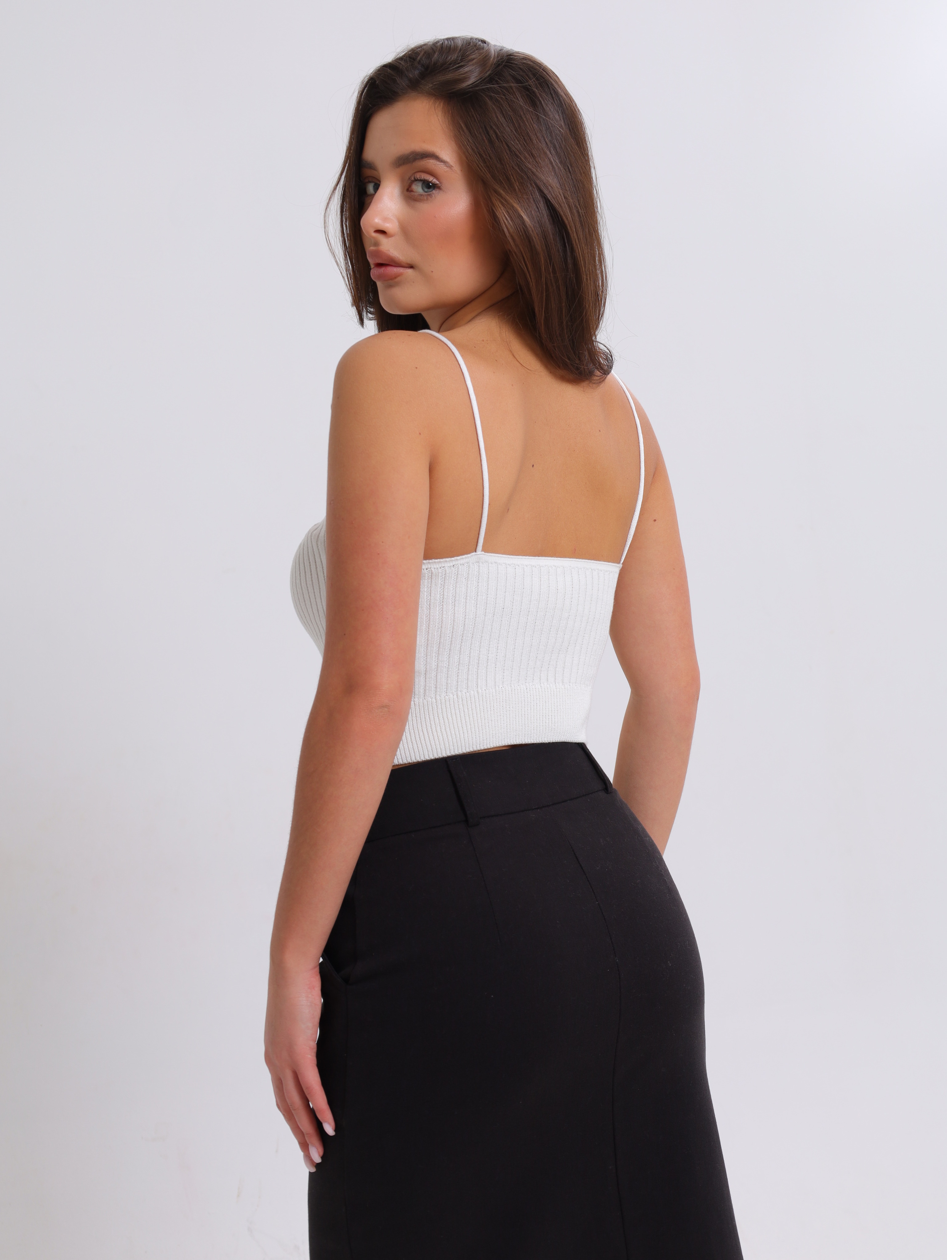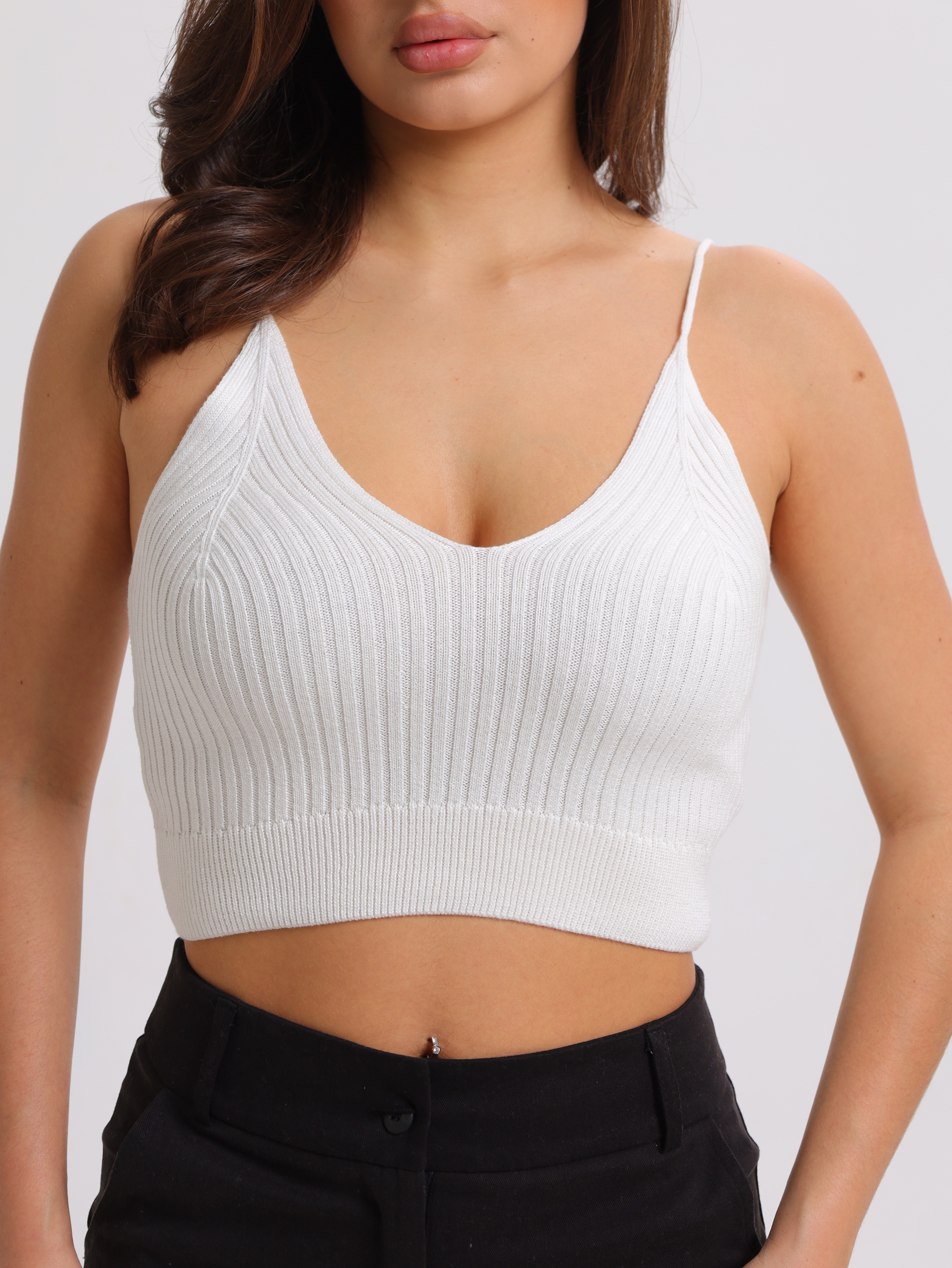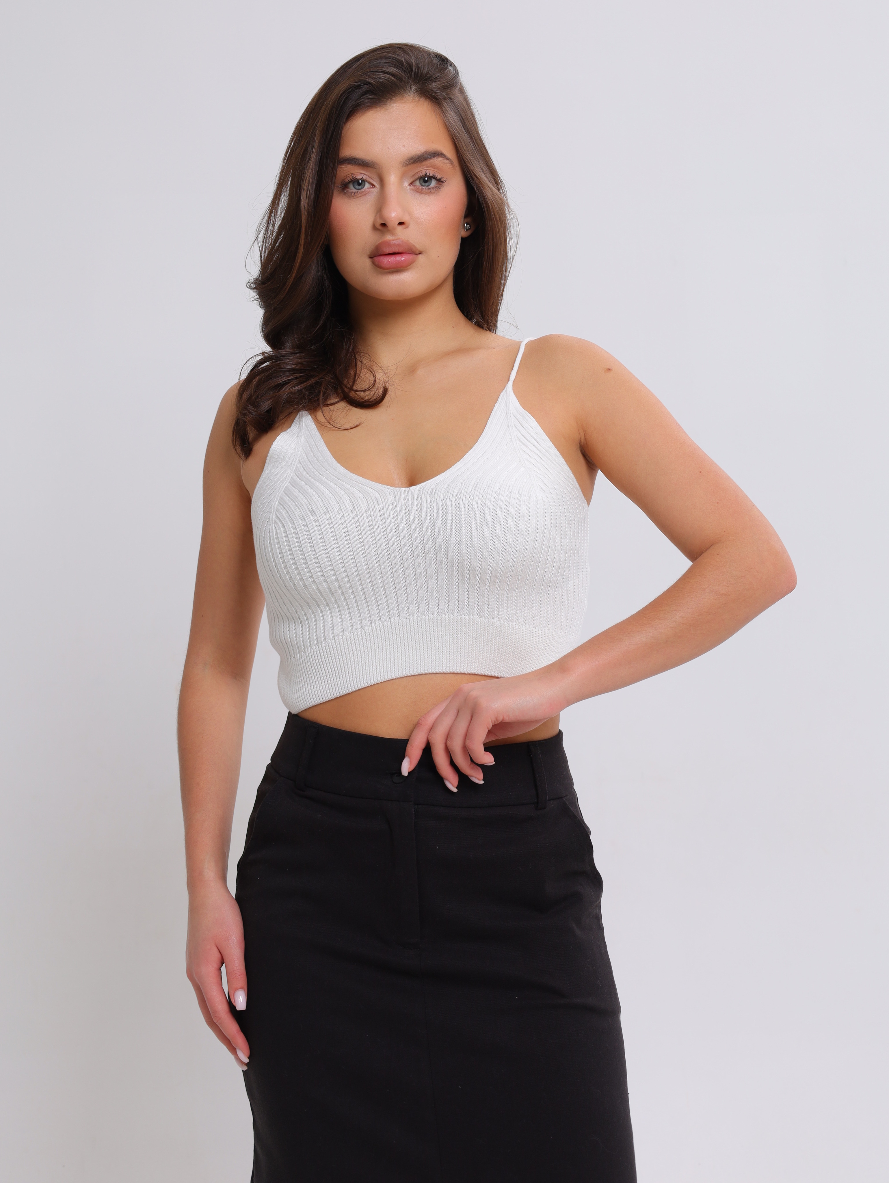Вязаная текстура в рубчик придаёт топу особый шарм, делает его визуально интересным и приятным на ощупь.