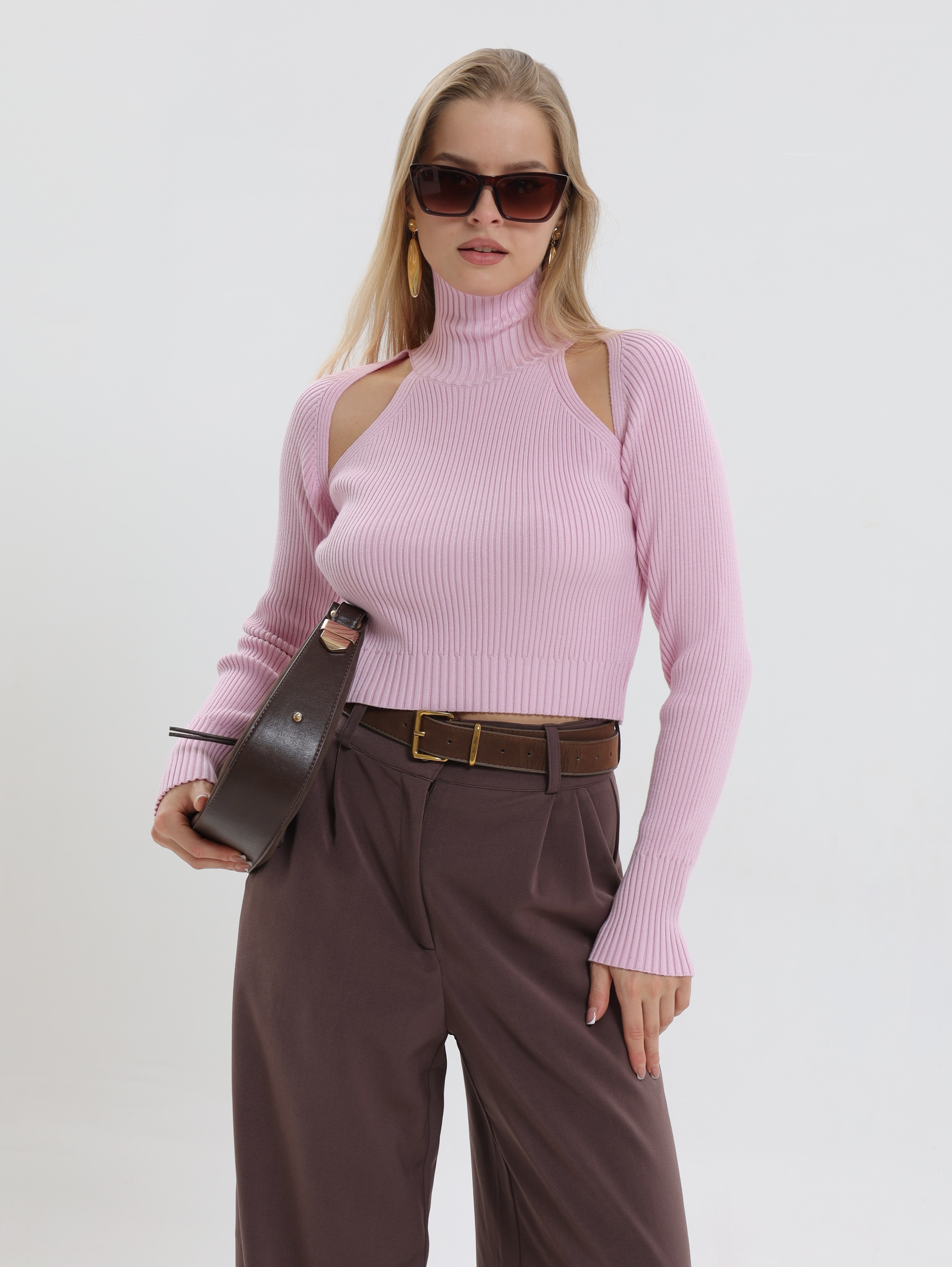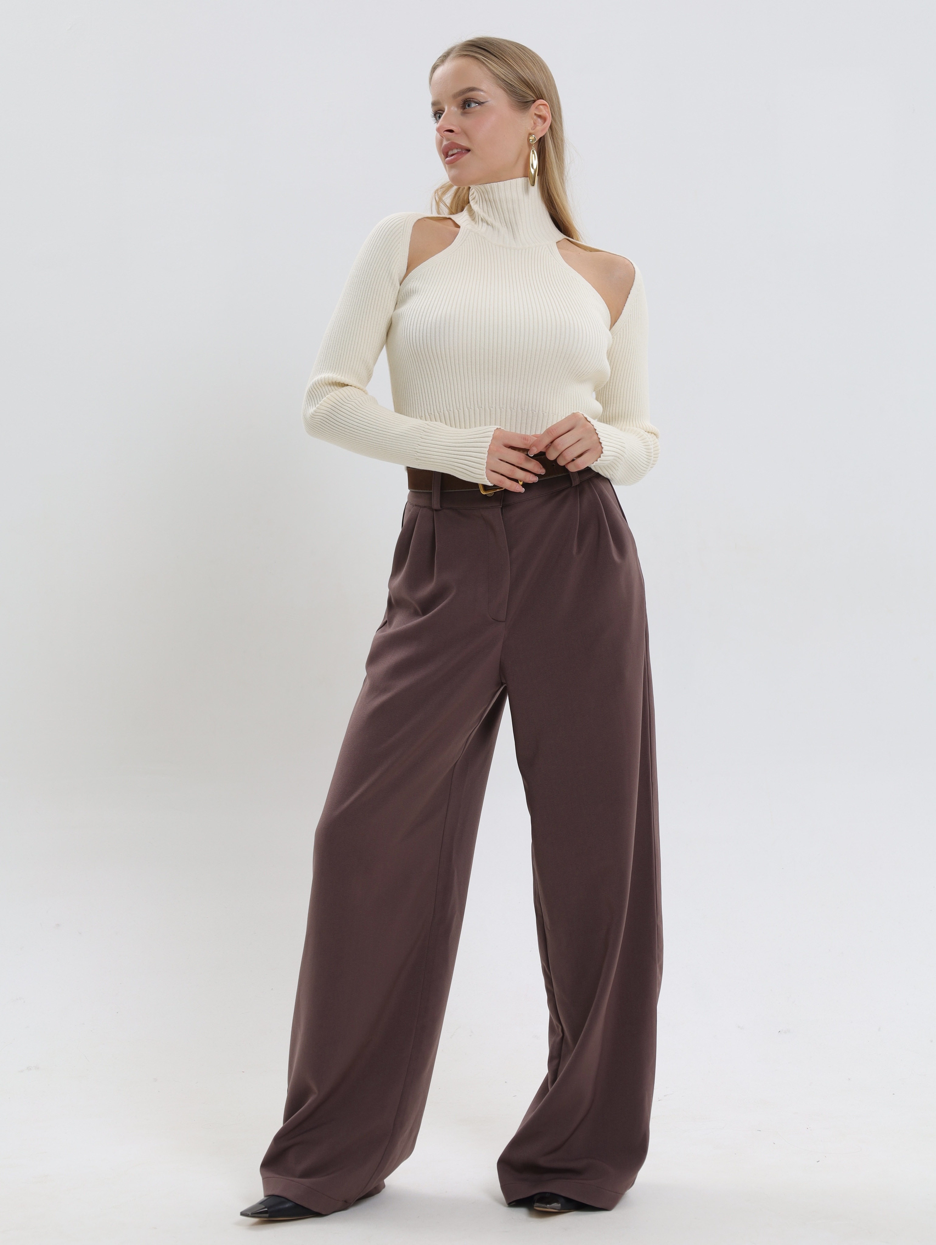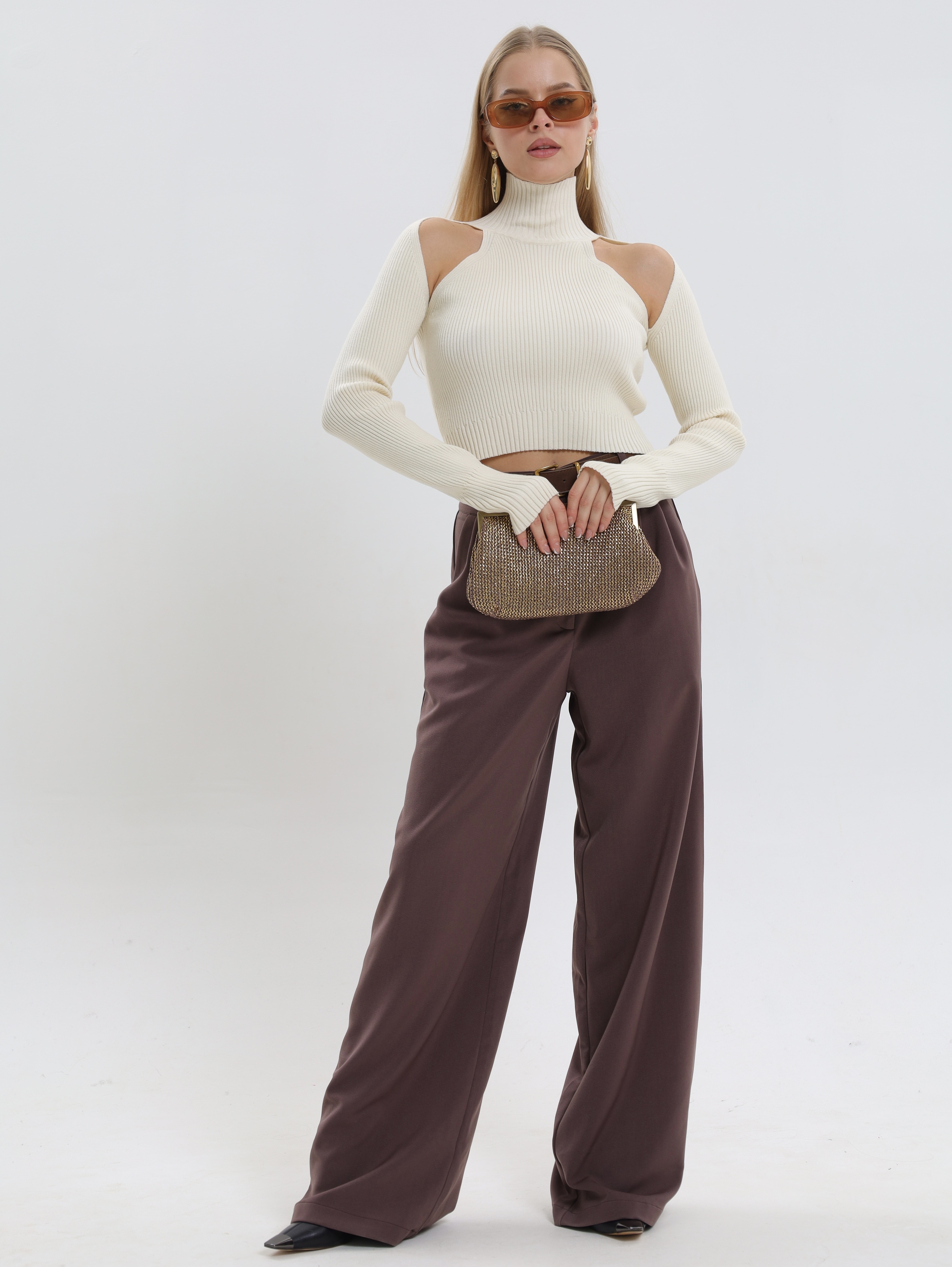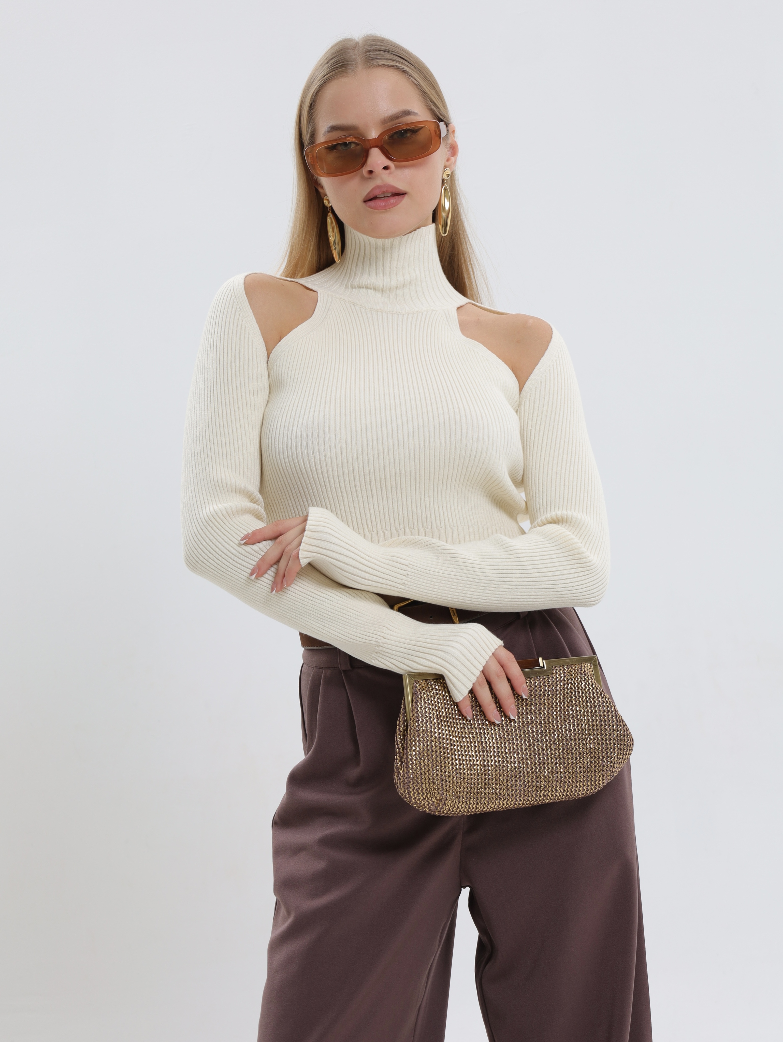 Высокий воротник-стойка создаёт гармоничный баланс с открытыми плечами, добавляя образу строгости и утончённости.