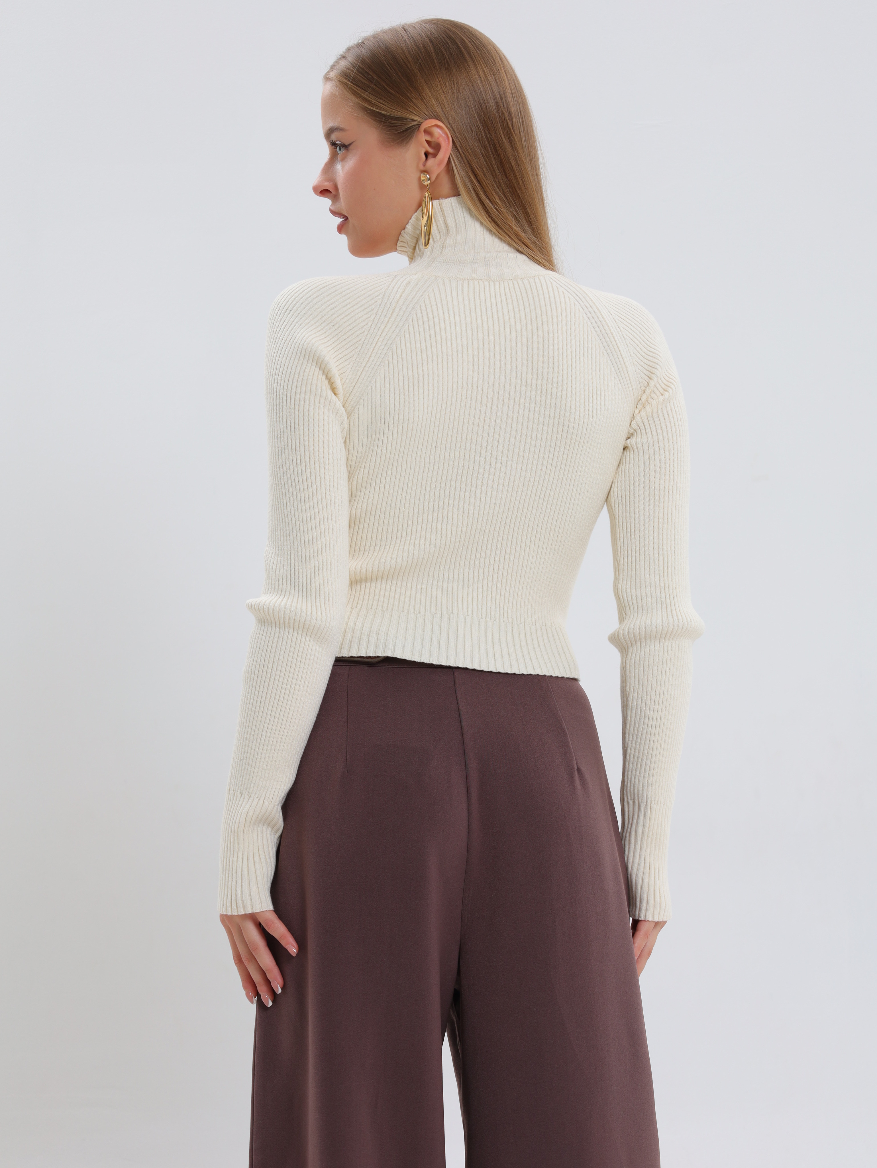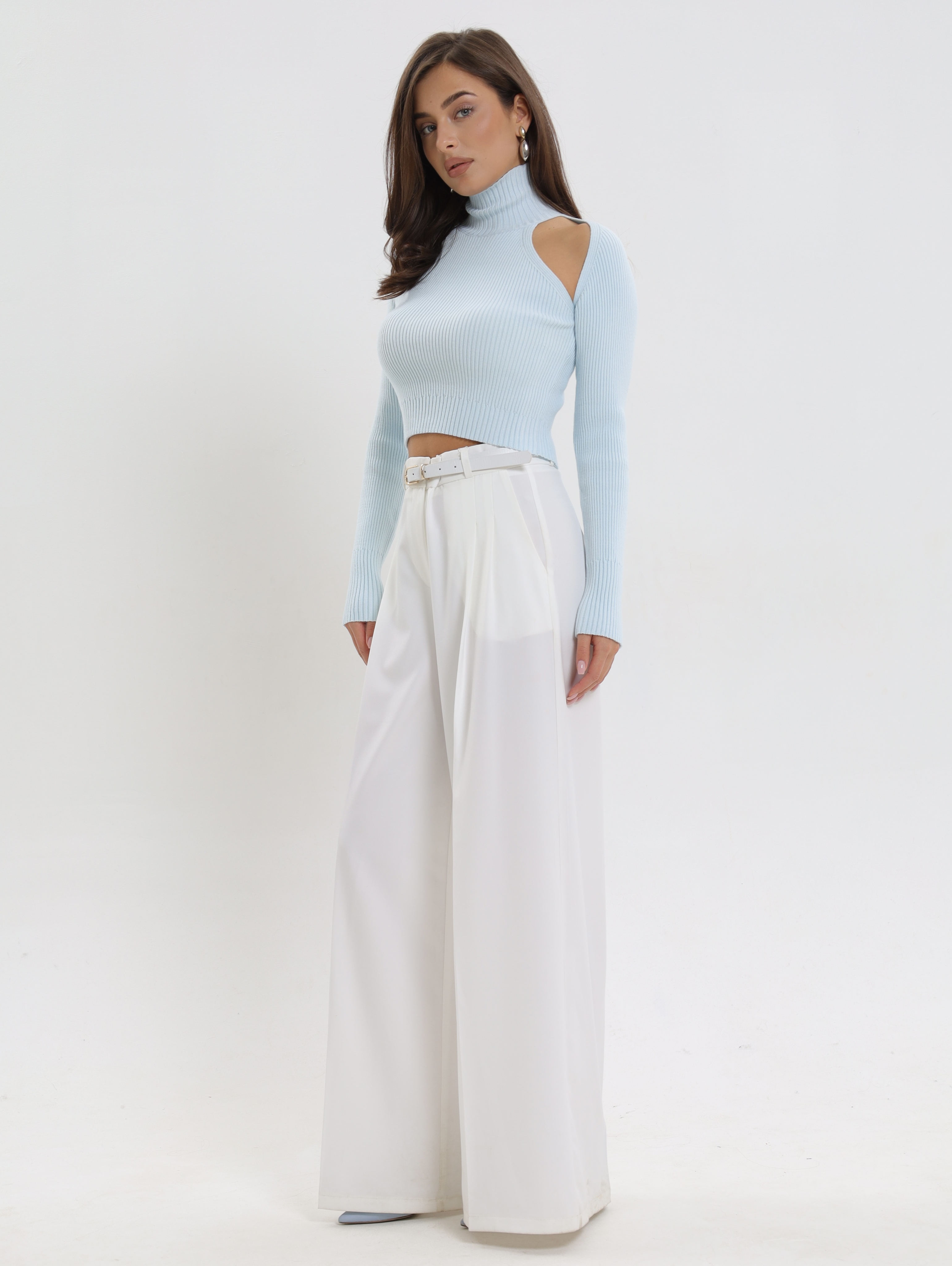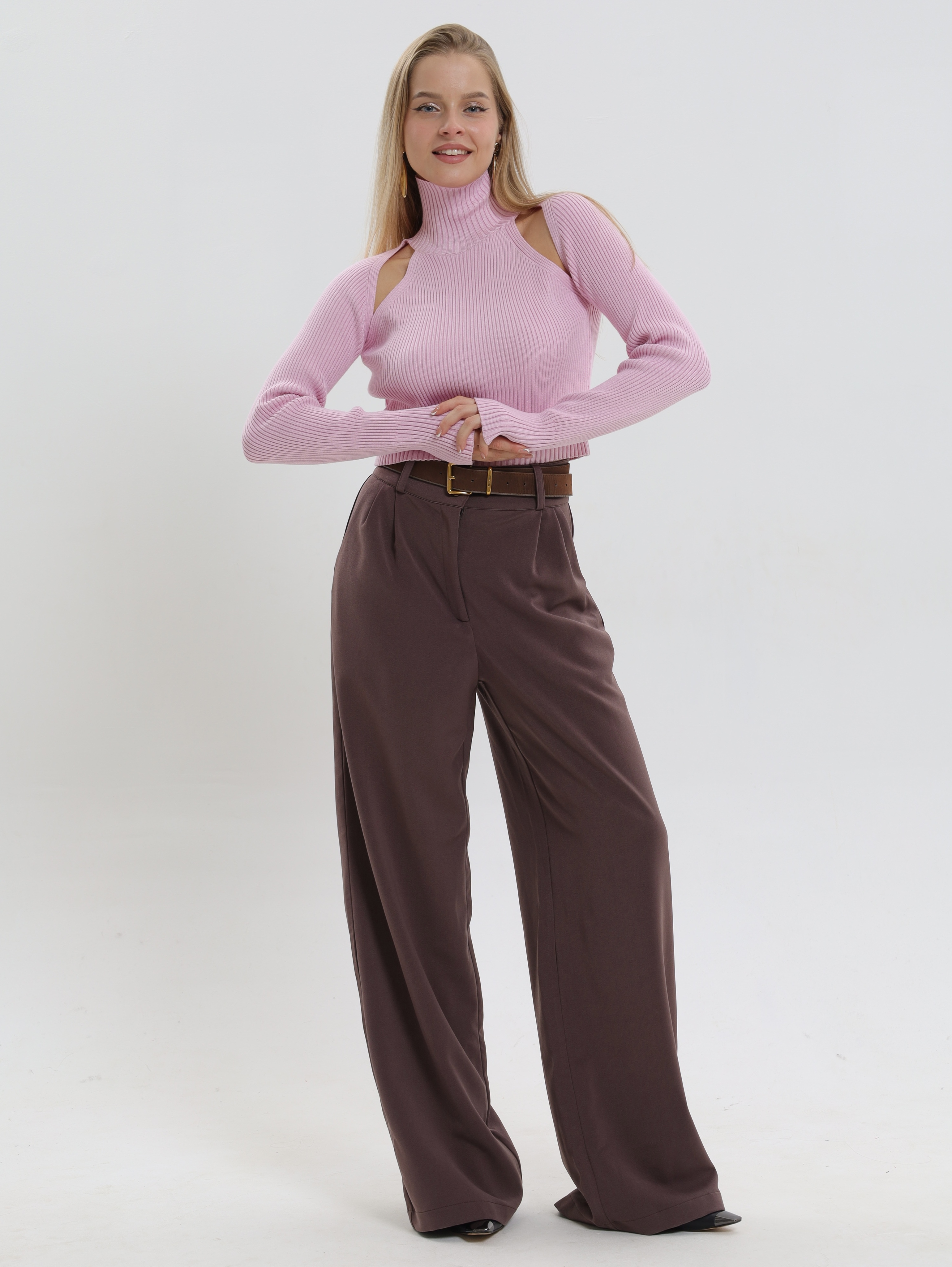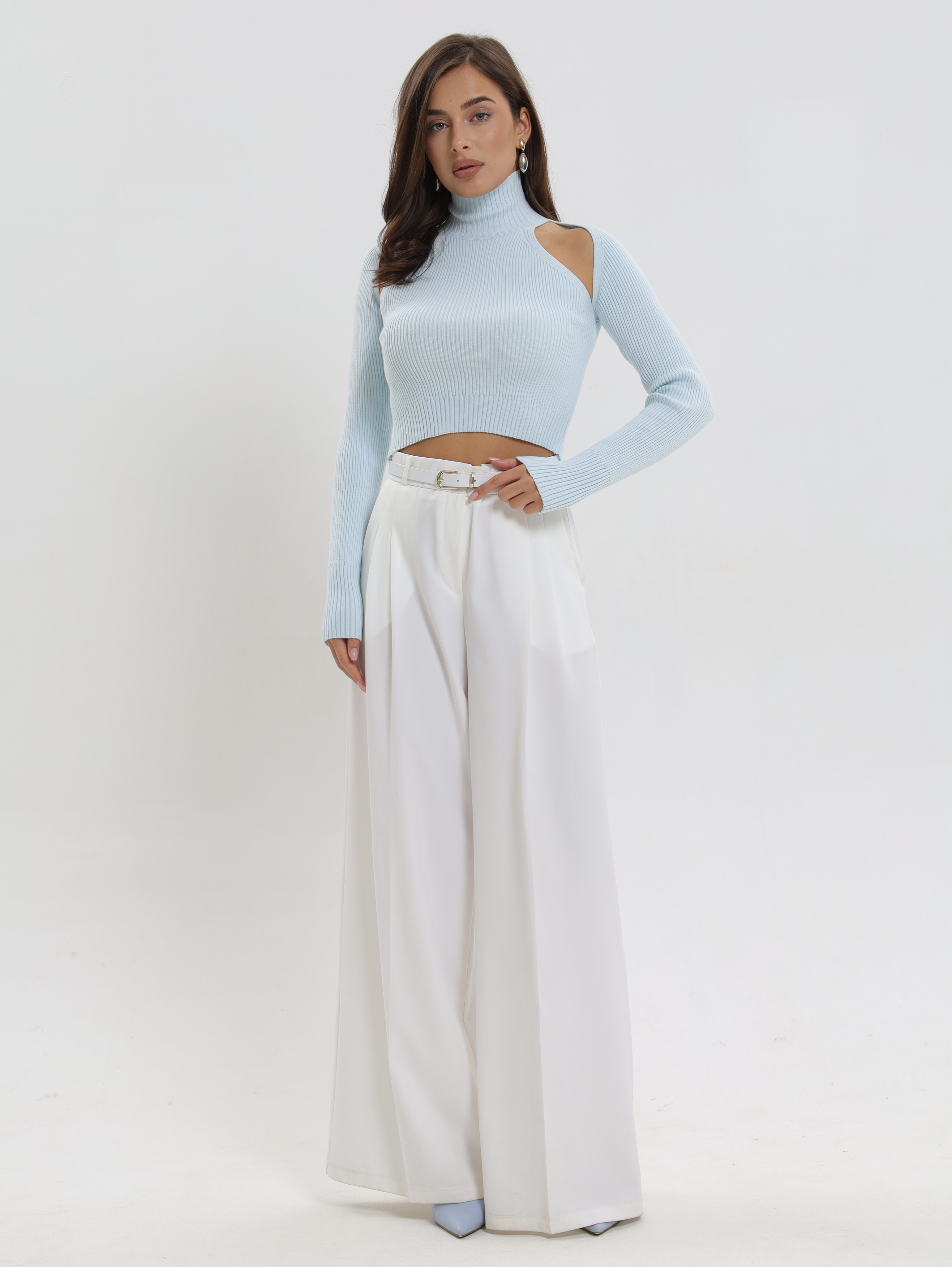 Высокий воротник-стойка создаёт гармоничный баланс с открытыми плечами, добавляя образу строгости и утончённости.