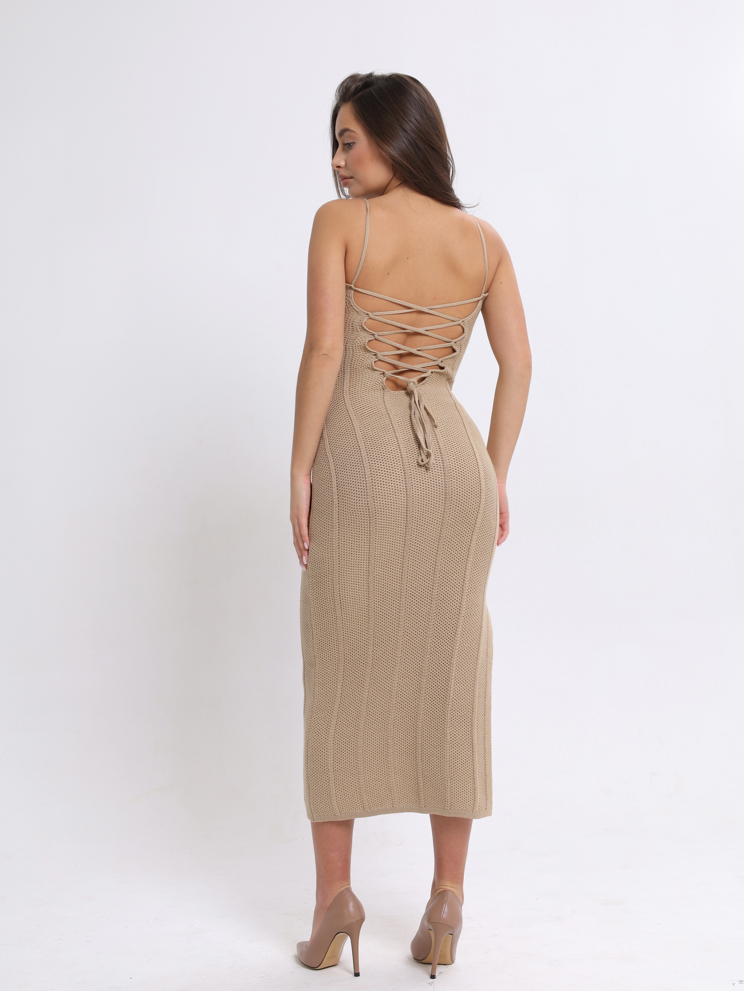 Изящная шнуровка на спине служит акцентом, придавая платью индивидуальность и позволяя точно настроить посадку по фигуре.